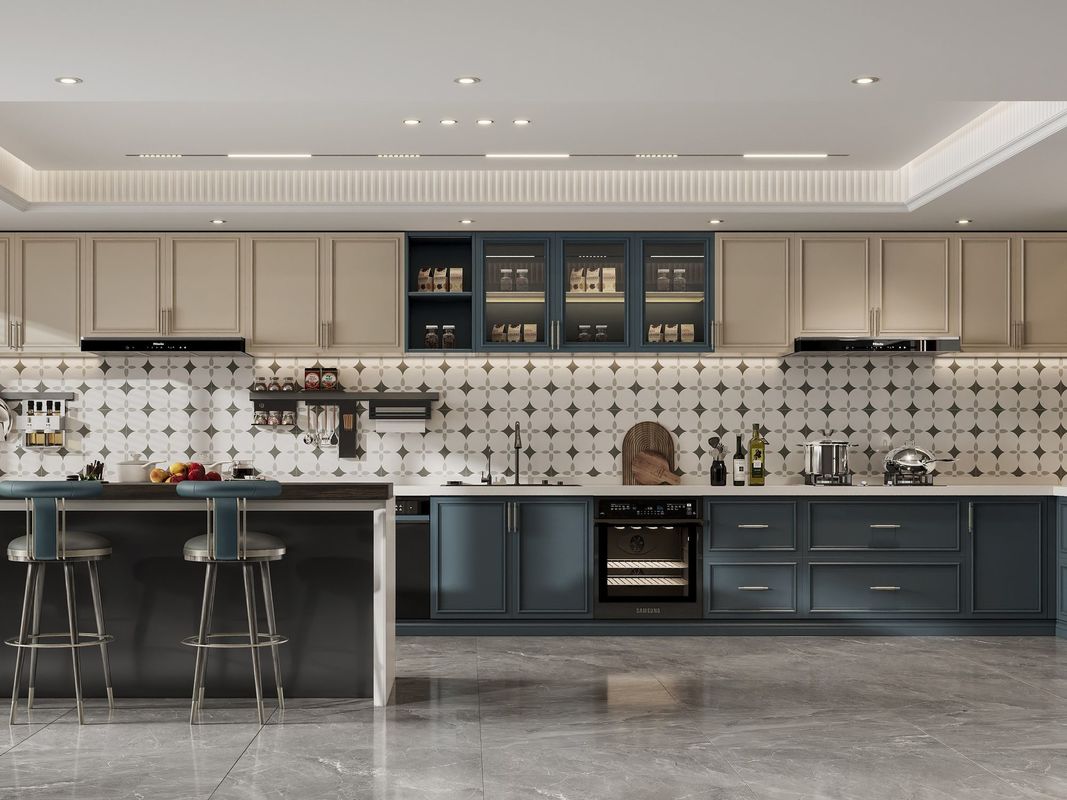 | Q: Can this Versatile French Style Kitchen Cabinet With Indigo Blue And Cream be customized for a project? Yes. The current page already supports customization through French Style and The cabinets feature a sophisticated color palette of navy blue and creamy beige, complemented by light marble flooring and a white ceiling with custom molding and recessed lighting. From an SEO and conversion perspective, that specificity helps the product match custom-project searches instead of reading like a one-size-fits-all stock item. |