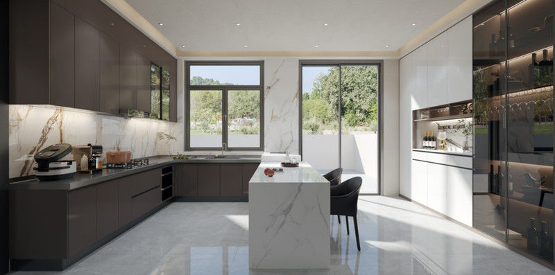 | Cabinet Body Color | Dark-toned body that adds depth to the overall kitchen design, creating a balanced contrast with the lighter flooring. |