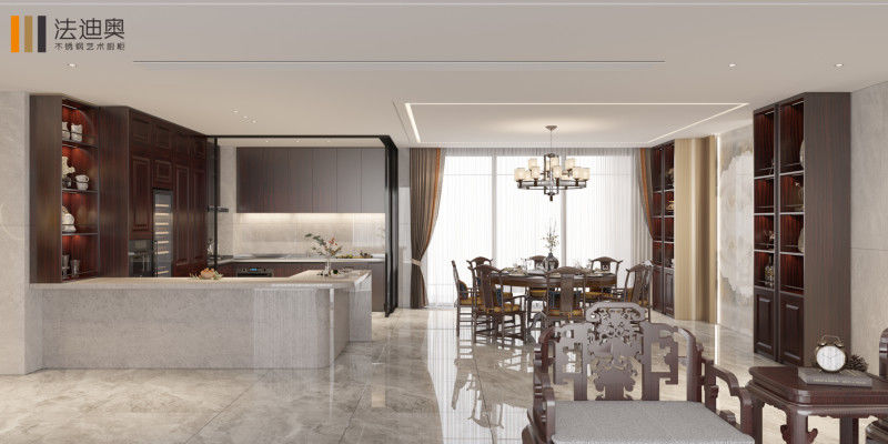| - Chinese Kitchen: Natural Stainless Steel: Matches the modern aesthetic and offers practical benefits. Cabinet Features | - Chinese Kitchen: Glass Doors: Offer versatile space division, allowing for the creation of two distinct cooking areas. |