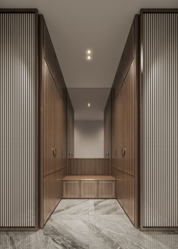 Introducing Fadior’s sophisticated Chinese-style wardrobe, where traditional elegance meets modern functionality. The wardrobe features light brown wood grain door panels with delicate yellow trim accents, adding a touch of refinement and contrast. The matching wall panels create a seamless and cohesive look, while the dark wood grain cabinet body provides a rich, elegant backdrop. Complemented by light-colored marble flooring, this wardrobe enhances any space with its timeless appeal. Constructed from premium stainless steel, it ensures long-lasting durability and resistance to wear, making it an ideal choice for custom home projects that require both beauty and strength.
