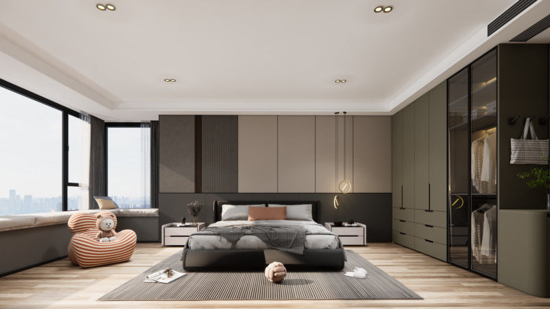 | Wardrobe Layout | Full-height design on one side with a ground-level cabinet, and a separate partitioned walk-in closet on the other. |