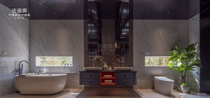 Fadior positions this bathroom vanity as a custom-manufactured solution for buyers who need more than a catalogue finish. The page now focuses on Stainless steel cabinet structure, layout planning, and Ample storage within the cabinet, including spacious drawers and open shelving accented in red, providing both so a supplier evaluation can happen with less guesswork.