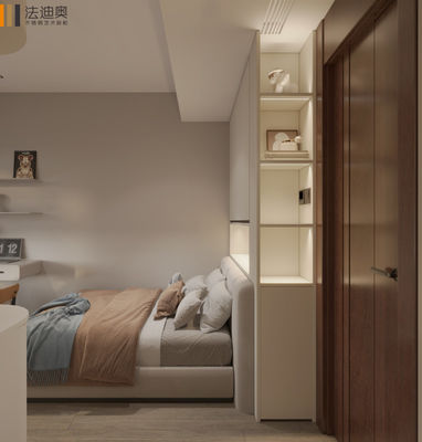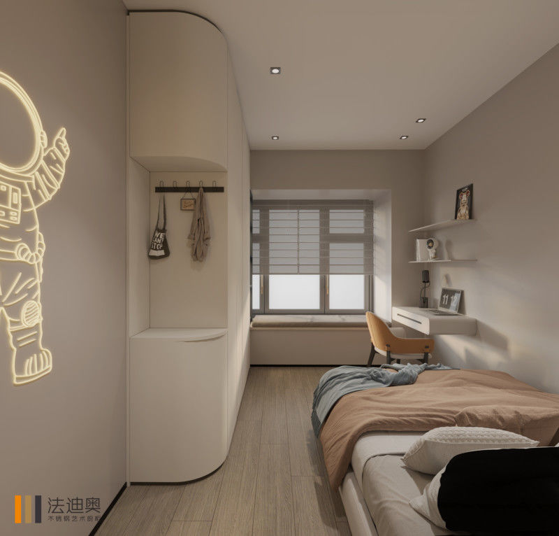 The Fadior stainless steel children's wardrobe represents a perfect blend of modern design and practical functionality, tailored to enhance any child's room. Featuring a sleek off-white finish, this wardrobe is constructed from high-quality stainless steel, ensuring durability and a contemporary aesthetic. The wardrobe’s design includes a full-height closet adjacent to the door, the center section is hollowed out to create a separate open compartment. for easy access to smaller items and is equipped with integrated LED lighting to illuminate the contents effectively. The base unit is designed with side-opening doors, making it convenient for storing larger items such as luggage or seldom-used belongings. On the opposite side, the wardrobe extends to the ceiling and is adjacent to a bay window, utilizing a handle-free design for a clean, minimalist look. Above the bay window, there is an extended bookcase ideal for organizing books and toys. The area near the door features an open hanging rack and curved cabinetry, while the interior is designed with multiple foldable zones to encourage organizational habits in children.