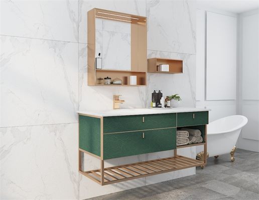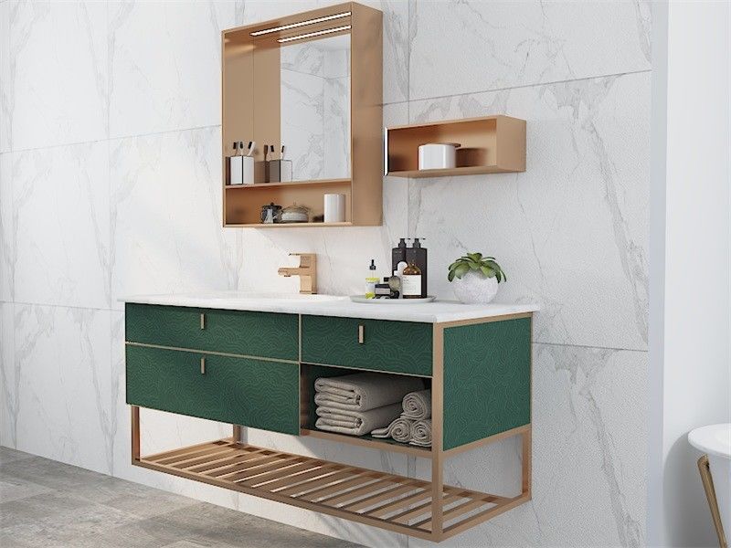 Introducing the Fadior Lotus green stainless steel bathroom cabinet, a blend of modern elegance and durable functionality. With a deep green matte finish, this floating cabinet brings a sleek, contemporary style to any bathroom. Its stainless steel construction provides unmatched durability, ensuring longevity in high-moisture environments like bathrooms. This cabinet is more than just a storage solution; it’s a design centerpiece that combines open shelving with discreet compartments, offering versatile storage. The brushed gold accents, quartz countertop, and integrated LED lighting add a touch of luxury, making this piece both practical and visually stunning. A perfect fit for those seeking quality, durability, and style in their bathroom furniture.