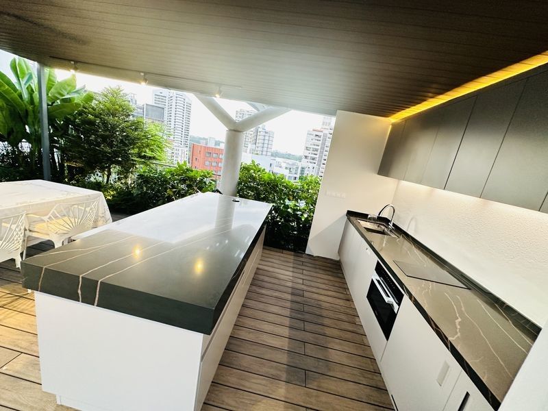 | Appliances | Equipped with integrated stainless steel appliances, including an oven and dishwasher, perfect for a fully functional outdoor cooking experience. |
