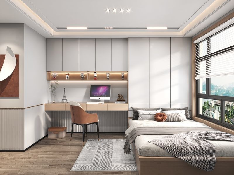 | Workspace | Integrated desk area with spacious work surface and shelving for books and decorations, creating a dedicated study zone within the bedroom. |