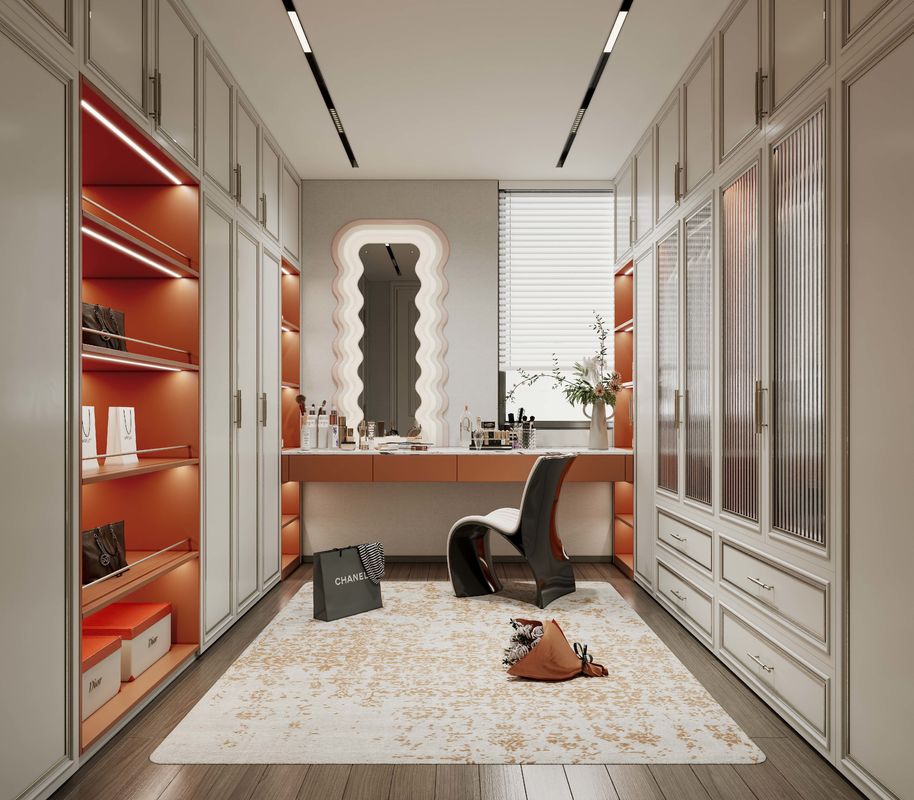 | Q: What defines the design of this Stainless Steel Walk-In Closet With Orange Accents And Artistic Wave? This Stainless Steel Walk-In Closet With Orange Accents And Artistic Wave is shaped around Modern Style. The page content points to a more resolved, project-led composition rather than a generic module set, which gives buyers a clearer view of how the product will read once installed. |