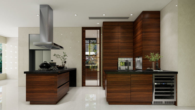 This custom kitchen cabinet is built around a differentiated finish strategy: Walnut paired with Stainless steel cabinet structure. That combination gives buyers a warmer luxury expression without losing the cleanability and project durability expected from stainless steel cabinetry.