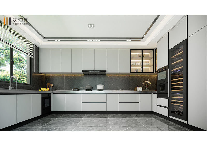 | Q: Is this Elegant And Modern U-Shaped Stainless Stee Kitchen Cabinet mainly decorative or genuinely project-ready? It reads as project-ready because the page still ties the styling back to Stainless steel cabinet structure, countertop coordination, and appliance planning. That keeps design language connected to execution logic. |