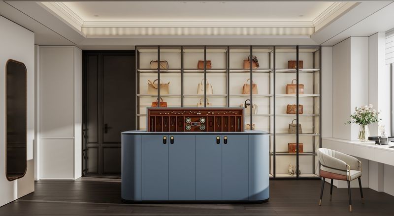 | Storage Layout | Display shelving with glass door for accessories on one side; concealed storage cabinets on the other |