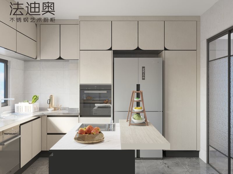This custom kitchen cabinet by Fadior combines modern aesthetics with innovative functionality, making it an ideal choice for any contemporary home. The U-shaped layout maximizes storage while the multifunctional island offers versatility, providing additional workspace, storage, and even seating. Featuring seamless appliance integration, the cabinets are crafted with durable stainless steel, designed with a wood grain finish and sleek arc-shaped doors for a minimalist, yet elegant look. The cabinet’s handle-free design maintains clean lines and modern charm, making it a perfect addition to a high-end kitchen.