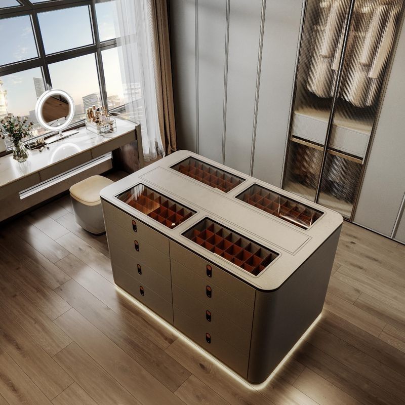| Island Storage | Central glass-top island with segmented compartments for jewelry, watches, and accessories |