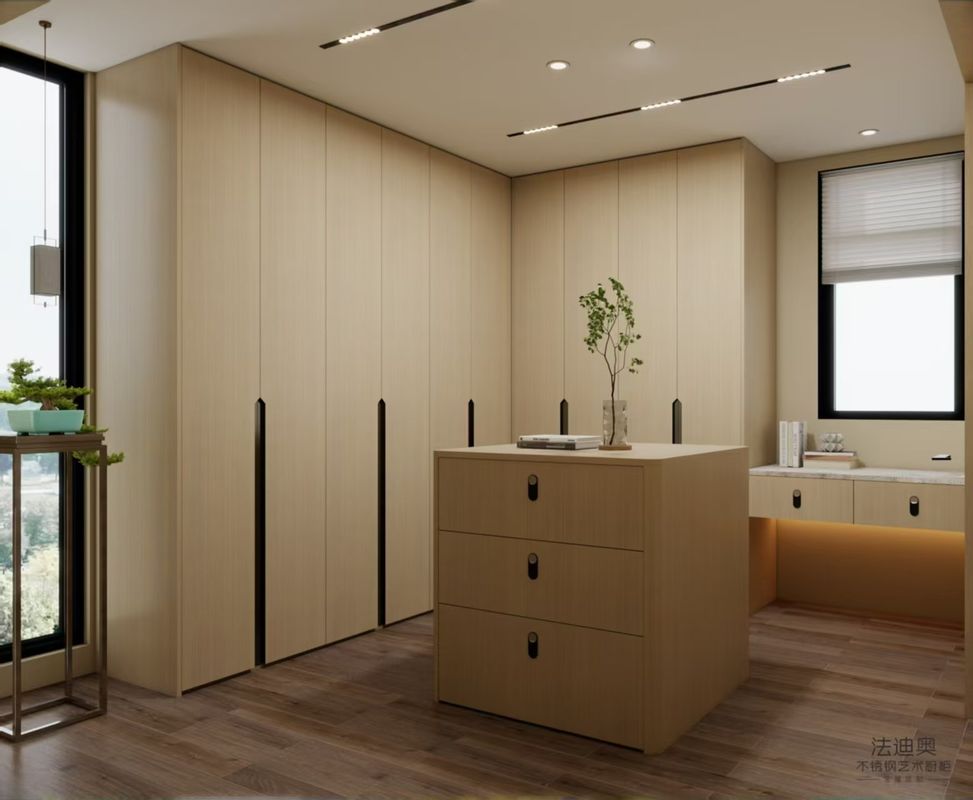 This L-shaped walk-in closet system combines the warmth of light oak wood grain with the durability of 304-grade stainless steel. The central island serves as both a dressing station and organizer, while the integrated desk under the window maximizes functional space in a cohesive design.
