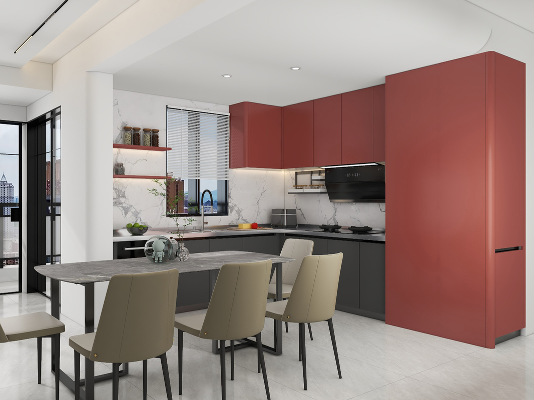 | Color & Finish | Matte Black base cabinets + Terracotta Red tall & overhead units; modern matte surface |
