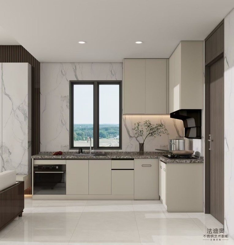 | Q: What should buyers know about maintaining this Modern Beige Stainless Steel L Shaped Kitchen Cabinet With Integrated? Maintenance expectations should be judged from Premium 304 stainless steel with a smooth beige matte finish. Stainless steel is highly resistant to corrosion, water, humidity, and fire, making it more durable than wood-based alternatives. Keeping the language tied to the visible material and finish evidence makes the page more credible than generic claims about durability or lifespan. |