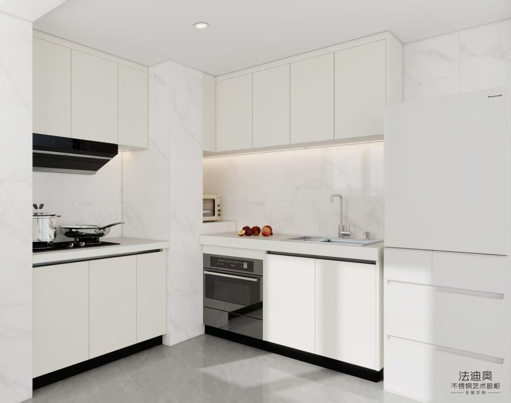 | Material & Performance the collection – A trusted leader in stainless steel whole-home customization, offering kitchens that combine resilience with refined aesthetics. Built from 304 stainless steel, finished in a uniform white tone. Fadior holds ISO 9001:2015 quality certification and passes ENF-grade formaldehyde emission testing — the strictest environmental standard in the industry, confirming zero detectable formaldehyde release. |