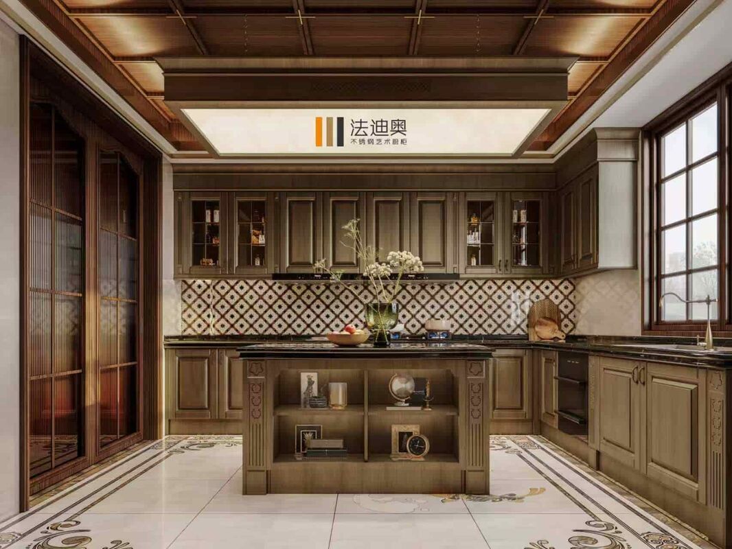 | Material & Performance Classic luxury, combining traditional wood finishes with modern stainless steel accents for a refined, timeless look. Stainless steel ensures long-lasting resistance to heat, corrosion, and stains, making the cabinetry both practical and chic. Fadior holds ISO 9001:2015 quality certification and passes ENF-grade formaldehyde emission testing — the strictest environmental standard in the industry, confirming zero detectable formaldehyde release. |