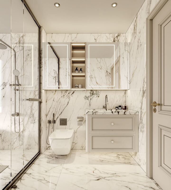 Soft white tones create a calm atmosphere, enhancing spatial brightness and timeless bathroom elegance.