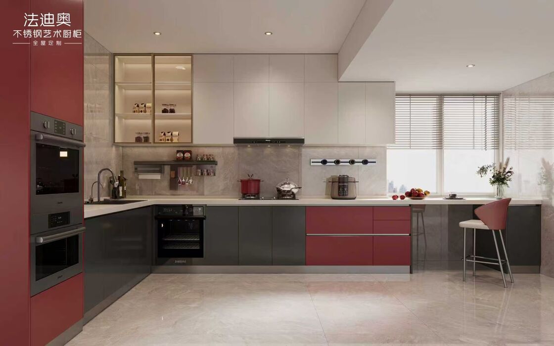 Make a bold architectural statement with this urban open-plan kitchen featuring wine red accent doors paired with matte dark gray cabinetry. Built on Fadior's full stainless steel construction, this design delivers moisture resistance, heat tolerance, and formaldehyde-free safety for modern family living.