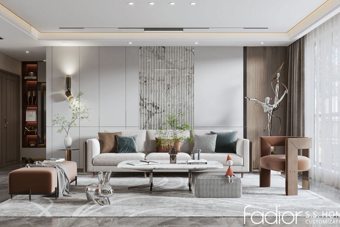 A: Yes, cabinet dimensions, finishes, and decorative panels can be fully customized. The neutral tone palette includes soft beige and warm wood textures that complement most modern interior designs, with additional color options available upon request.