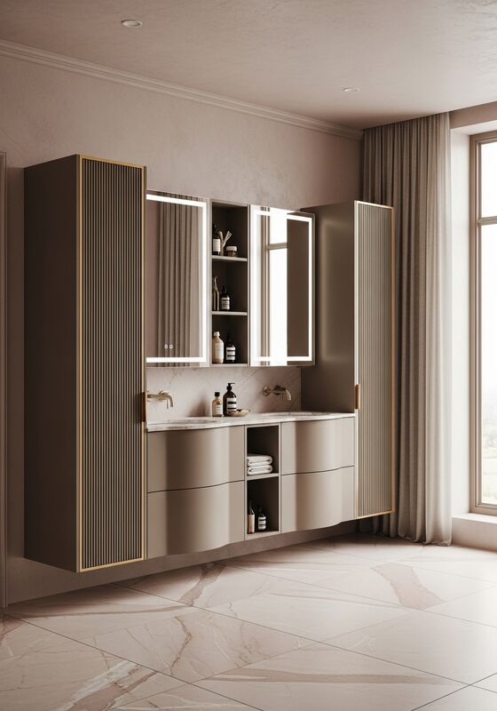 | Design HighlightsWarm minimalist with artisanal metalwork detailing; diffused tonal palette direction with warm mushroom taupe dominant; pale champagne accents; champagne gold metalwork; soft rose marble countertop option, disciplined proportions, and vertical micro-fluted panel doors at 15mm pitch in warm mushroom taupe lacquer. The page should read as a resolved specification, not a generic storage box. |