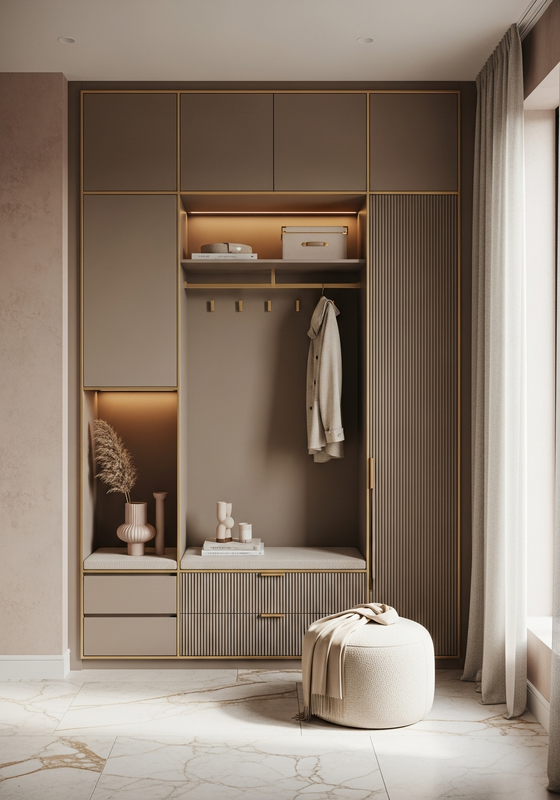 Fadior positions this shoe storage cabinet as a project-grade solution built around 304 food-grade stainless steel with matte taupe powder-coat lacquer finish, steel-based wardrobe panels with matte taupe lacquer finish, and a matching stone or steel surface top for entryway or bedroom shoe and accessory storage for elevated residential interiors. This specification focuses on Vertical micro-fluted wardrobe doors at 15mm pitch in warm mushroom taupe lacquer, Champagne gold PVD-coated stainless steel frame reveals with satin 5mm accent so designers, dealers, and project buyers can evaluate fit, finish, and delivery logic with less guesswork.