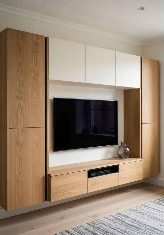 | Size Planning | Configured to approved site dimensions and full-width tv wall unit with concealed storage and floating shelves, with module widths and clearances confirmed before production. |