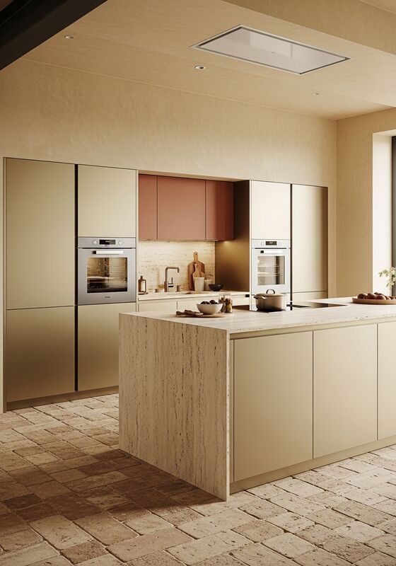 | Material & Performance304 food-grade stainless steel with PVD champagne-gold coating; natural honed travertine; terracotta-tone matte polyester lacquer on MDF substrate panels; dark iron-black powder-coated steel accents supports moisture resistance, finish stability, and long-term daily use in primary kitchen island for open-plan residential spaces; designed as focal point in mediterranean, spanish revival, or warm contemporary interiors; suitable for coastal and desert climates where material warmth counters bright light. That matters when buyers need architectural appearance without wood-based maintenance risk. |