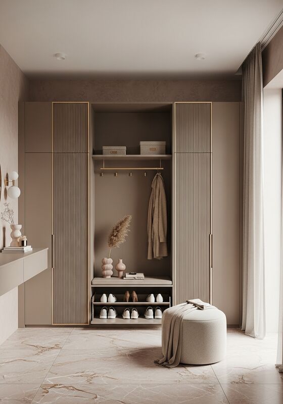 | Q: What cabinet depth is usually recommended for a shoe storage cabinet? Recommended depth depends on the room type, circulation width, appliance adjacency, and storage brief. In most premium projects, depth is decided during layout review rather than copied from a catalog, because a better-fitting module plan improves both appearance and daily usability. |