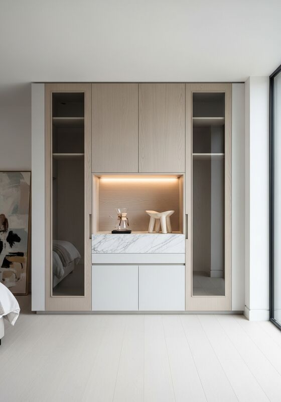 | Q: Is 304 food-grade stainless steel structural system with quarter-sawn European white oak veneer (ultra-matte finish), matte white lacquer accent panels, clear float glass with polished edge necessary for this bedroom wardrobe? For premium projects, 304 food-grade stainless steel structural system with quarter-sawn European white oak veneer (ultra-matte finish), matte white lacquer accent panels, clear float glass with polished edge is chosen because it holds up better against moisture, cleaning routines, and long-term dimensional movement than wood-based construction. That is especially relevant in primary bedroom walk-in wardrobes, dressing rooms, luxury residential closet systems, architect-specified storage installations where buyers want a cleaner maintenance story without giving up a tailored finish direction. |