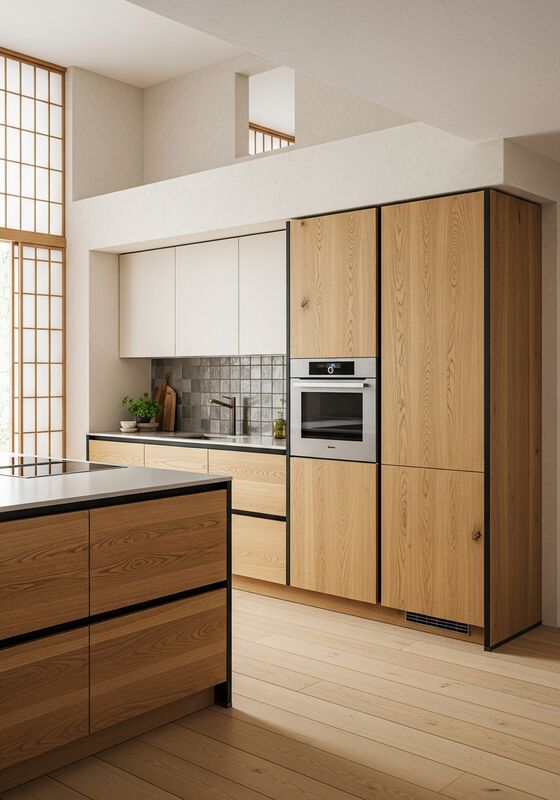 | Material & Performance304 food-grade stainless steel structural core with natural Japanese oak veneer (straight grain, oiled matte), warm parchment-white lacquer panels (eggshell flat finish), hand-forged dark oxidized iron accent frames supports moisture resistance, finish stability, and long-term daily use in primary kitchen cabinetry for residential spaces seeking calm, natural warmth; ideal for east or southeast-facing kitchens with morning light; suited to open-plan living where kitchen merges with dining and contemplative spaces. That matters when buyers need architectural appearance without wood-based maintenance risk. |