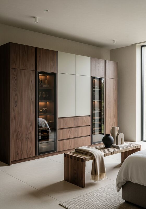 | Material & Performance304 food-grade stainless steel structural chassis with thermal break insulation core; exterior clad in dark American walnut wood-grain laminate (open-pore matte, horizontal grain); bronze-tinted smoked float glass door system with 6mm polished edge reveal; cashmere taupe matte lacquer accent modules; brushed bronze hardware and ventilation grille supports moisture resistance, finish stability, and long-term daily use in climate-stable wine storage for 150-200 bottles in dual temperature zones; integrated storage for stemware, decanters, and service accessories; designed for basement installation with humidity resistance and thermal efficiency; suitable for residential wine rooms, entertainment level wet bars, and hospitality-inspired home entertaining spaces. That matters when buyers need architectural appearance without wood-based maintenance risk. |