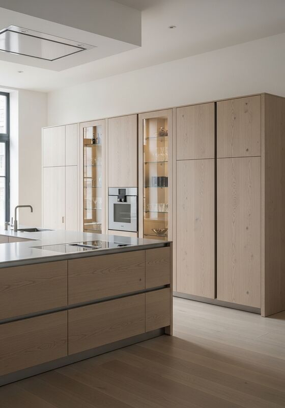| Material & Performance304 food-grade stainless steel structural system with quarter-sawn European white oak veneer (ultra-matte, near-zero sheen), matte white lacquer accent panels (eggshell finish), clear float glass with polished edges supports moisture resistance, finish stability, and long-term daily use in premium residential kitchens in architect-designed homes, art collector residences, gallery-adjacent living spaces, and projects requiring calm, light-maximizing cabinetry. That matters when buyers need architectural appearance without wood-based maintenance risk. |
